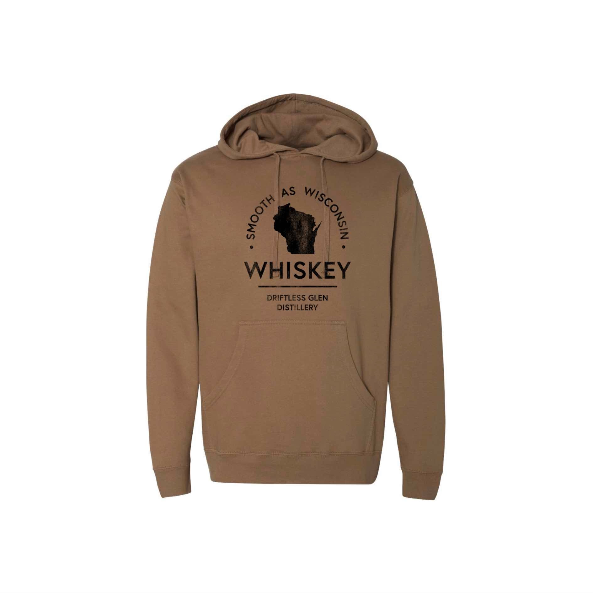 This heavyweight saddle brown hoodie has saddle brown drawstrings and features our black "Smooth as Wisconsin whiskey" logo on the front.